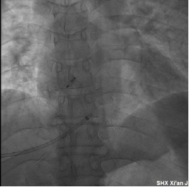 两周前,来自宁夏回族自治区固原市的患者杨先生突发心前区疼痛,于当地医院诊断为“急性ST段抬高性心肌梗死(广泛前壁)”,急诊行冠脉造影见:左前降支近段完闭塞,立即给予球囊扩张、冠脉内溶栓及血栓抽吸等治疗后,管腔仍存有附壁血栓,但血流恢复,症状缓解。因患者既往合并“布加综合征、下腔静脉血栓、左髂静脉血栓、肺栓塞”病史,病情复杂且危重,当地建议转上级医院进一步诊治。患者与家属慕名来到西安交大一附院结构性心脏病科就诊。接诊的魏峰副主任医师详细询问患者病情后,考虑患者并非单纯的传统意义上的心肌梗死,由静脉血栓反常栓塞至冠脉导致急性心肌梗死可能性大。遂即完善了冠脉造影、心动超声、右心声学造影检查。冠脉造影显示左右冠脉完全正常,左前降支管壁光滑,无狭窄、夹层及血栓影;心动超声示:前间隔、左室前壁搏幅减低,卵圆孔未闭;右心声学造影示:Valsalva动作后即刻左心可探及大量微气泡;动态心电图未监测到房颤等心律失常。反常栓塞RoPE(Riskof Paradoxical Embolism)评分7分,以上高度提示反常栓塞。胡志副教授看过病人后考虑此病例罕见,静脉血栓经开放的卵圆孔栓塞于冠状动脉引起心肌梗死的可能性大,封堵卵圆孔可预防再次出现心、脑等重要脏器致命性栓塞,但患者既往存在下腔静脉狭窄伴血栓形成,需评估下腔静脉手术入路;同步下腔静脉造影显示左髂静脉及下腔静脉肝下段血栓形成,管腔狭窄、闭塞,奇静脉开放伴大量侧枝静脉回流建立(图1)。