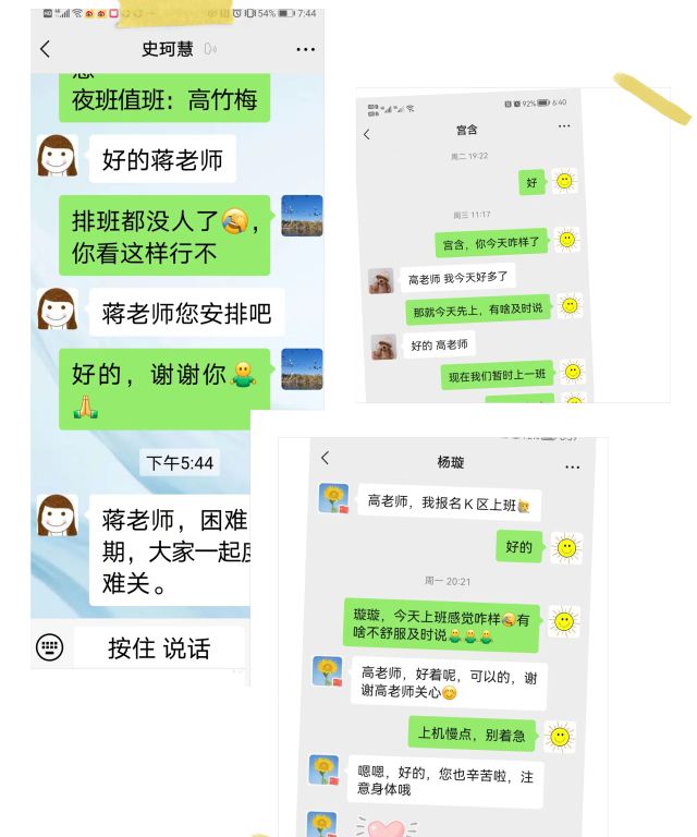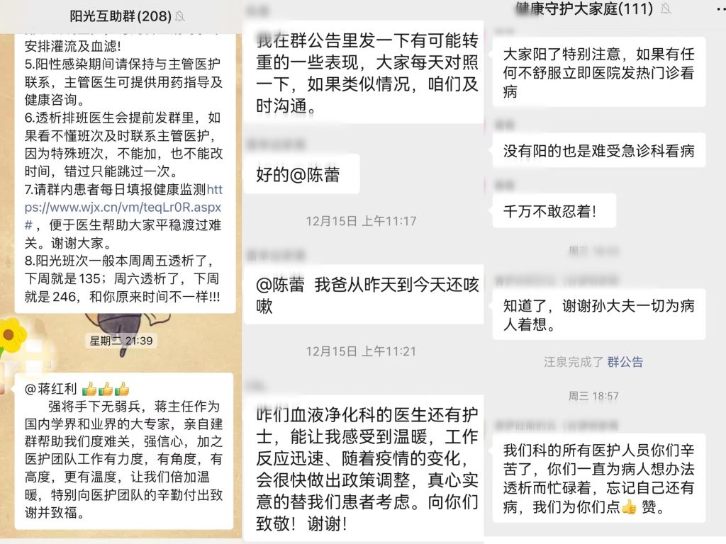 透析患者群里,患者们也都纷纷在微信群里向医院及科室工作人员们发来感谢:“强将手下无弱兵,蒋主任作为国内学界和业界的大专家,亲自建群帮助我们度难关、强信心,加之医护团队工作有力度、有角度、有高度、更有温度,让我们倍加温暖,特别向医护团队的辛勤付出致谢并致福。”患者家属韩先生为医护人员竖起了大拇指。“咱们血液净化科的医生还有护士,能让我感受到温暖,工作反应迅速、随着疫情的变化,会很快做出政策调整,真心实意的替我们患者考虑。向你们致敬!谢谢”!“科室的所有医护人员你们辛苦了,你们一直为病人想办法透析而忙碌着,忘记自己还有病,我们为你们点赞!”……一句句朴实无华的感谢和肯定,足以表达千言万语。