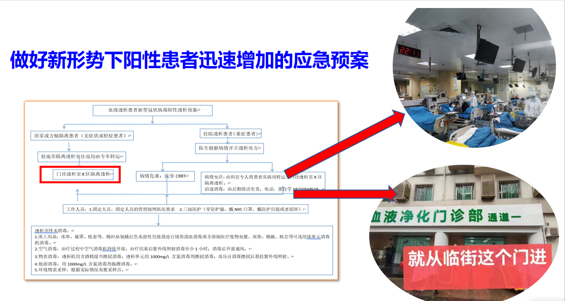 对于重症肾脏病•血液净化科说,防控也是一个严峻考验。血液透析作为一个特殊的科室,还不能完全放开不管,将阴阳混着一起治,因为透析病人的身体是非常脆弱的。在阳性透析患者数量激增的情况下,为了保障每一位透析患者都能够及时的治疗,科室重新制定血液净化室新冠感染防控方案,保证透析室不出现聚集性感染,降低阳性患者增加的数量。