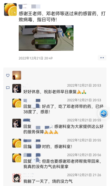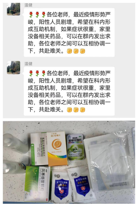 鉴于很多患病的同事无法起身获得药品和礼包,几位患病初愈的老师积极发挥党员先锋模范作用,在完成急诊抢救室的一线抗疫支援工作后,还多次为居家的病患同事上门送药,带去科室的慰问和关心。