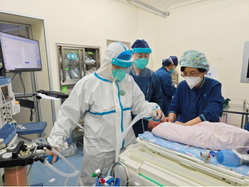 温健副主任连续3天顶着39.5℃的高烧坚守岗位。作为分管临床工作的副主任,他每天除临床沟通调度外,还毅然担负起了各种危急重症的抢救工作。期间,有一名超早产儿因视网膜病变需行手术治疗,由于温健考虑自己已经新冠阳性,麻醉操作时距离小儿非常近,而早产儿又呼吸道保护机制尚未发育完善,为了避免小儿感染新冠,温健副主任穿上了防护服,防止传给小朋友。手术期间在眼科雷剑琴教授团队熟练的操作下,新生儿科周熙会主任团队、温健副主任和邓斌副主任医师共同精准的管理下,密不透风的隔离衣阻隔不了麻醉医生对患者的关爱。同事们都劝生病的他休息一下,他说“正是困难时刻,我要做好作为一名党员干部的带头和引领作用,现在还不能倒下”。