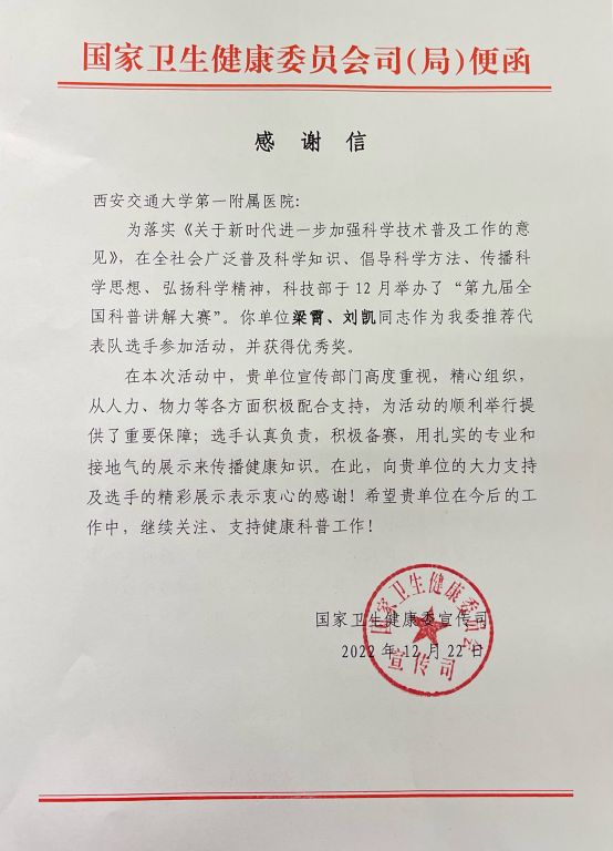 近日,我院收到来自国家卫健委宣传司的感谢信。信中写到:为落实《关于新时代进一步加强科学技术普及工作的意见》,在全社会广泛普及科学知识、倡导科学方法、传播科学思想、弘扬科学精神,科技部于12月举办了“第九届全国科普讲解大赛”。你单位梁霄、刘凯同志作为我委推荐代表队选手参加活动,并获得优秀奖。在本次活动中,贵单位宣传部门高度重视,精心组织,从人力、物力等各方面积极配合支持,为活动的顺利举行提供了重要保障;选手认真负责,积极备赛,用扎实的专业和接地气的展示来传播健康知识。在此,向贵单位的大力支持及选手的精彩展示表示衷心的感谢!希望贵单位在今后的工作中,继续关注、支持健康科普工作!