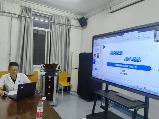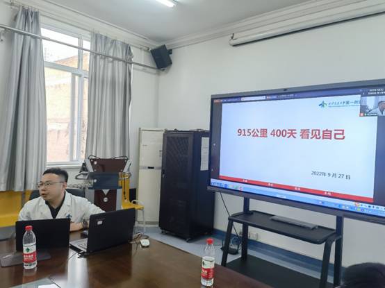 接下来由我院团委委员、门诊部团支部书记吴楠带来《915公里400天看见自己》主题分享。他从体会、收获、思考三方面介绍了在国家卫生健康委宣传司宣传处借调的经历,利用丰富生动的图片,沉浸式地讲述了自己在宣传司参与的各项工作。吴楠表示在国家部委借调这400天收获很多,体会到所有工作都要提前谋划、制定方案,掌握了有效的舆情处理方法,做到了“见自己”,即找差距,知不足,同时也充分利用自己丰富的门诊服务工作经验、医疗知识等专长做好借调部门的各项工作。鼓励我院青年人才能够抓住机遇,勇敢走出去,开阔眼界,努力成长。
