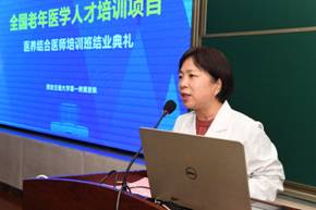 李红霞部长代表医院讲话,首先对各位学员完成培训学习以及优秀学员表示祝贺,同时对老年医学科对这次培训的精心组织和实施表示感谢。我国人口老龄化更加严峻,老年医学人才培养亟待加强,作为国家老年医学人才培训基地,交大一附院义不容辞承担了这次培训任务,各位学员通过2个多月来理论与实践学习,都有一定的收获和提升,希望大家把所学知识带回自己单位,发挥引领作用,共同提高老年医学健康领域工作。