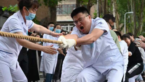 随着王晓琴副主席宣布比赛正式开始,整个活动现场顿时沸腾起来。往日里,认真严谨的医务工作者们化身成为运动健儿,各个精神抖擞,昂首阔步迈向比赛区。伴随着裁判员哨音,各队员扎稳马步、手握绳索、身体后倾,拼尽全身力气将绳子拉向自己队伍。赛场上,队员们挥洒汗水、全力拼搏;赛场旁,观众们激情呐喊、加油打气。一根小小的麻绳展现了运动员们力拔山河的勇者士气,更凝聚了队员们昂扬向上的团结力量,展现出了我院教职工勠力同心、积极向上的拼搏精神。赛场气氛紧张热烈,赛出了友谊,赛出了风格。