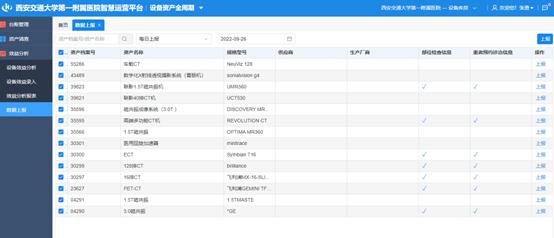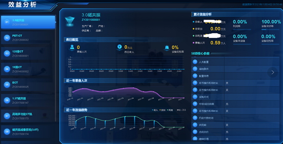 该平台已实现了与我院资产管理信息系统实时动态数据对接功能。下一步将并入东院区资产管理系统接口,并在平台的“大型设备经济效益分析模块”加入所有的大型医用设备,包括CT、PET-CT、手术机器人、磁共振、直线加速器、生命支持类设备、超声设备等,并与PACS和厂家完成数据对接,将设备的全生命周期信息以卡片的形式记录在设备智慧管理平台中,以实现对单台大型设备运行效益实时监测和分析,为院领导、科主任、资产管理员实时在线了解设备运行情况和进一步合理配置资源提供有效决策依据。
