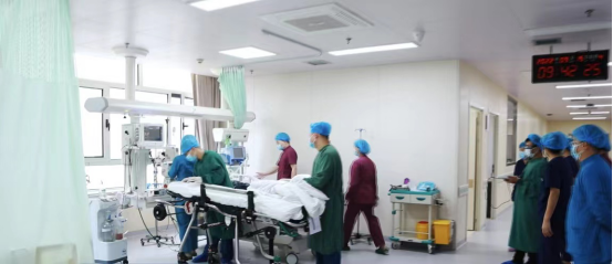 急诊中心杜俊凯主任、滕琰副主任第一时间对该患者病情作出评估并给出初步意见,在严密监测及呼吸机无创通气状况下液体复苏。在掌握第一手资料后,医院立即启动院内绿色通道,患者安全抵达我院急诊中心,经过检查生命体征稳定,绿色通道直接收治EICU,开始集束化救治。