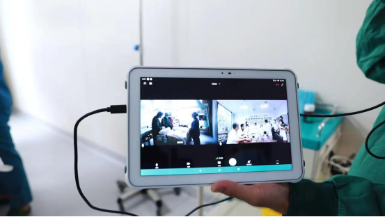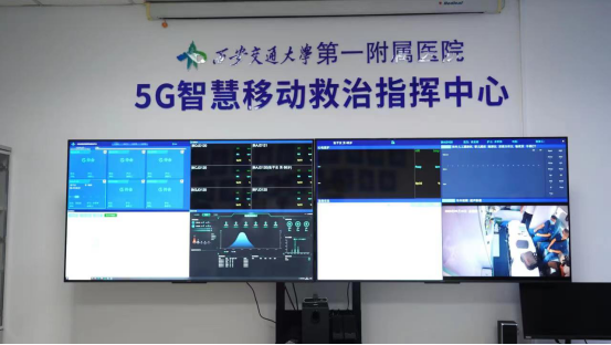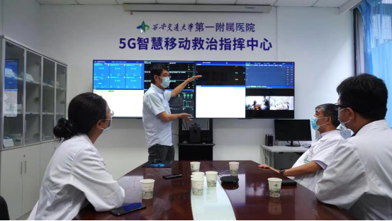 与此同时,在交大一附院5G智慧医疗指挥中心内,刘青光副院长、公共卫生中心许庆丽主任、急诊中心杜俊凯主任、滕琰副主任、医务部任洁副部长通过大屏幕查看5G高速网络传回的远端120急救车内画面以及患者生命体征数据,实时对患者病情进行远程监测和指导。