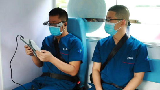 患者进入救护车内,急诊中心高亚洲主治医师和井军伟护士迅速利用随车5G医疗设备为患者进行生命指征、心电图、心肌酶及血气等一系列检查,并通过设置在车内的车载医疗设备同步将病人体征、病情记录等大量生命信息实时传递到位于交大一附院急诊中心内的指挥中心。