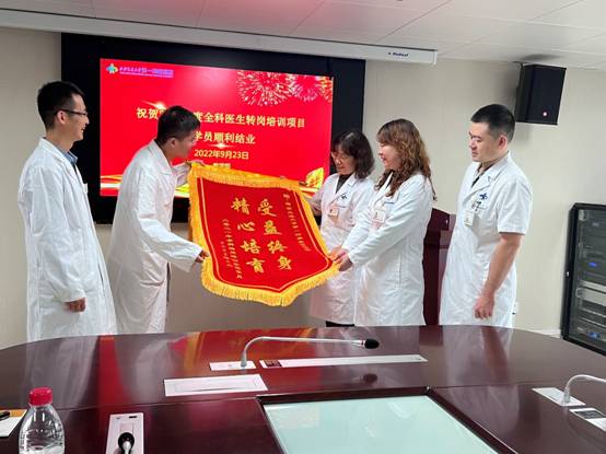 考核结束后,全科医师转岗培训的学员代表向教学部送上了锦旗,对教学部的各位领导与老师在培训过程中及日常生活上的帮助表达了感谢,通过在一附院的培训学习,扎实了自己的理论知识,拓展了医学前沿知识,提高了临床技能操作水平。黄燕萍部长和李雁副部长对全科转岗学员在我院的培训顺利结业表示祝贺,希望各位学员以后能保持终身学习的精神,积累知识与经验,精湛自己的医术,造福一方百姓。