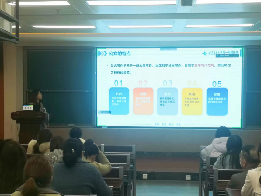 本次培训邀请党委·院长办公室副主任毛慧萍授课。毛主任以《规范行文·从我做起——医院公文写作实例交流》为题,聚焦医院公文写作的规则与要求、常见公文写作格式与方法、公文写作常见问题等进行详细讲解,并结合医院行文规范和工作实际,列举大量实例帮助大家理解公文的写作规范和要领。