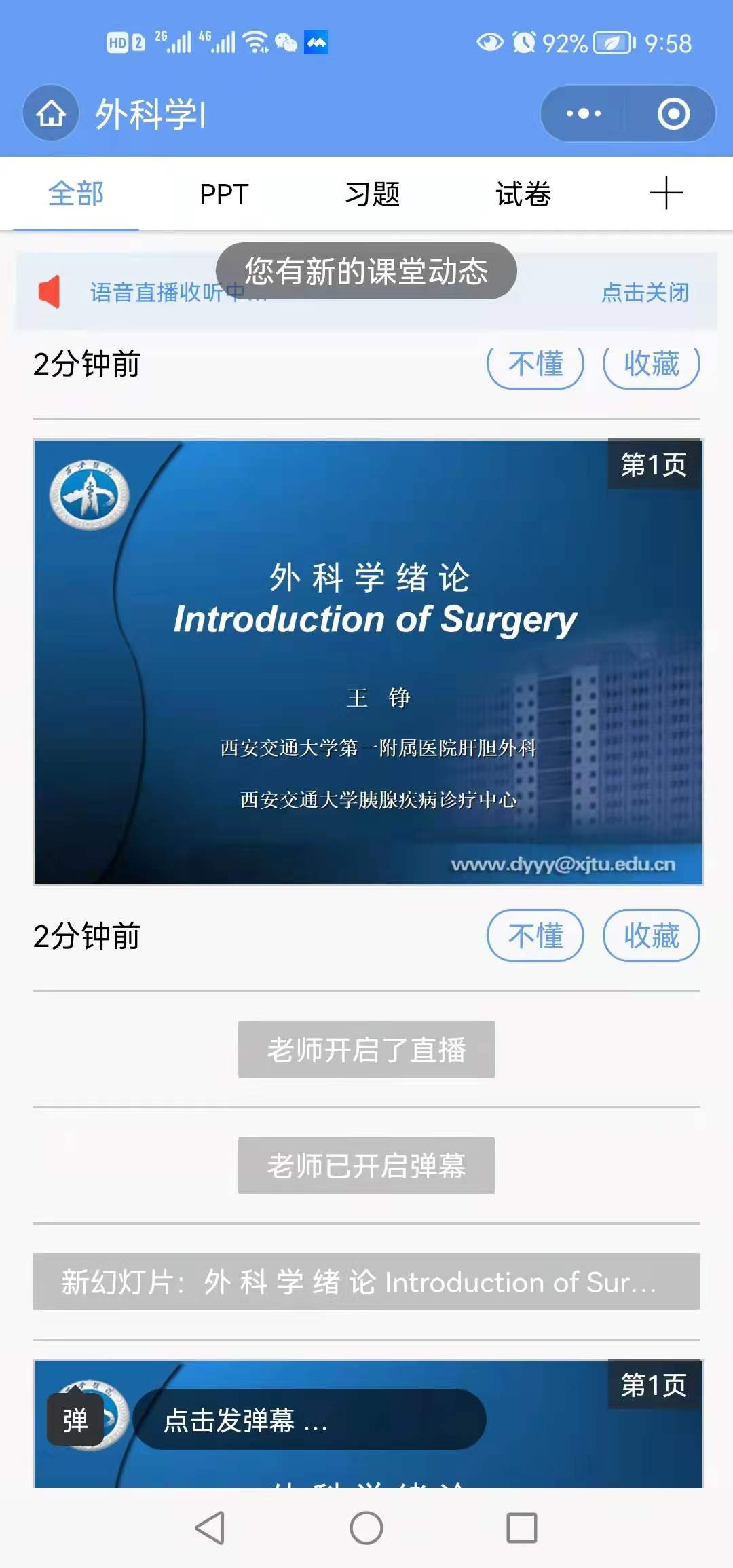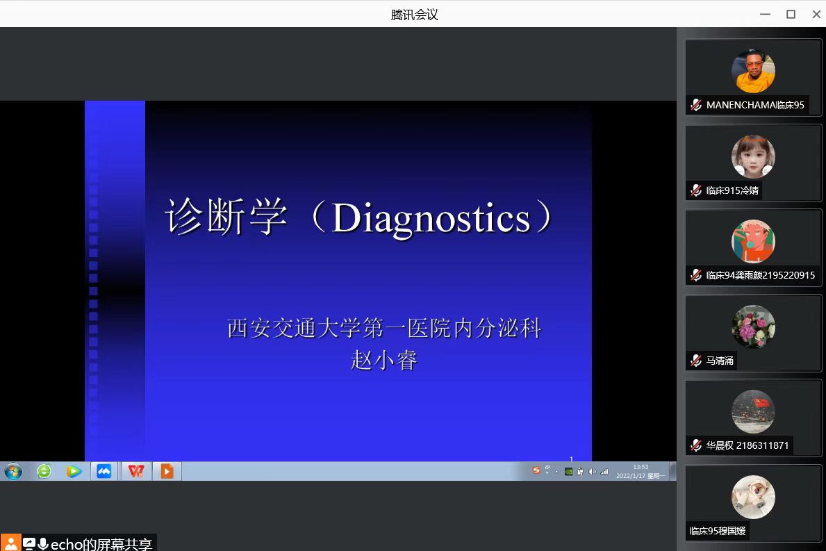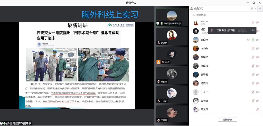 突如其来的疫情将古都西安按下了暂停键,学校也实行了封闭管理。但正如疫情下的西安有一群人仍然在日夜奔波一样,校园内外同样有一群人在教学秩序保卫战的阵地坚守与冲锋。根据属地疫情防控最新政策和要求,一附院响积极应学校政策提前启动2021—2022学年第二学期教学计划。2022年1月17日起,以线上教学方式开展下学期课程教学。在疫情防控期间,利用交大雨课堂按时开课。今天一附院共有10门临床理论课程按时开课,包括2017级:留学生神经病学、八年制眼科学、血液与肿瘤系统疾病,联合培养口腔科学;2018级:五年制急诊、耳鼻咽喉科学,留学生外科学、诊断学;2019级:五年制诊断学、外科学、核医学。