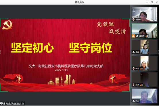 为发挥党建引领作用,筑牢疫情防控堡垒,2022年1月11日晚20:30分,交大一附院驻西安市胸科医院医疗队第九临时党支部召开第一次线上会议,并邀请团支部参加,宣传委员申存毅、组织委员、团支部书记(兼)万永、团支部副书记刘淼淼、团委委员刘洋、吕倩、张莹等参加会议。会议由第九临时党支部书记温绣蔺主持。