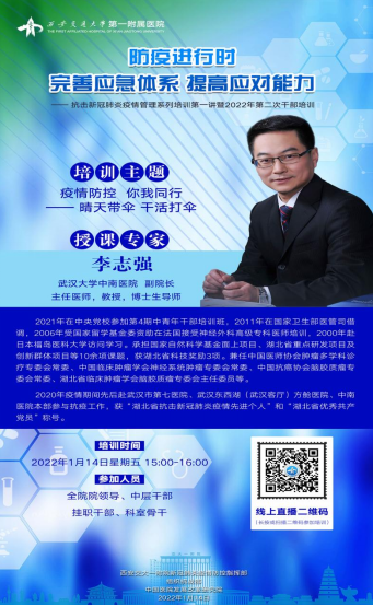 在当前疫情防控发起动态清零总攻的紧要关头,为进一步推进新冠疫情防控管理工作的创新发展,提升医疗业务和医院综合组织协调管理能力,我院组织统战部、中国医院发展改革研究院联合开展“防疫进行时——完善应急体系,提高应对能力”抗击新冠肺炎疫情创新管理系列培训。继2022年1月8日举办第一次培训之后,1月14日,特邀请武汉大学中南医院副院长李志强教授,以线上会议的形式向全体院领导班子成员、院长助理、党委委员、中层干部、青年骨干做专题报告。培训由院党委冯广林副书记主持。