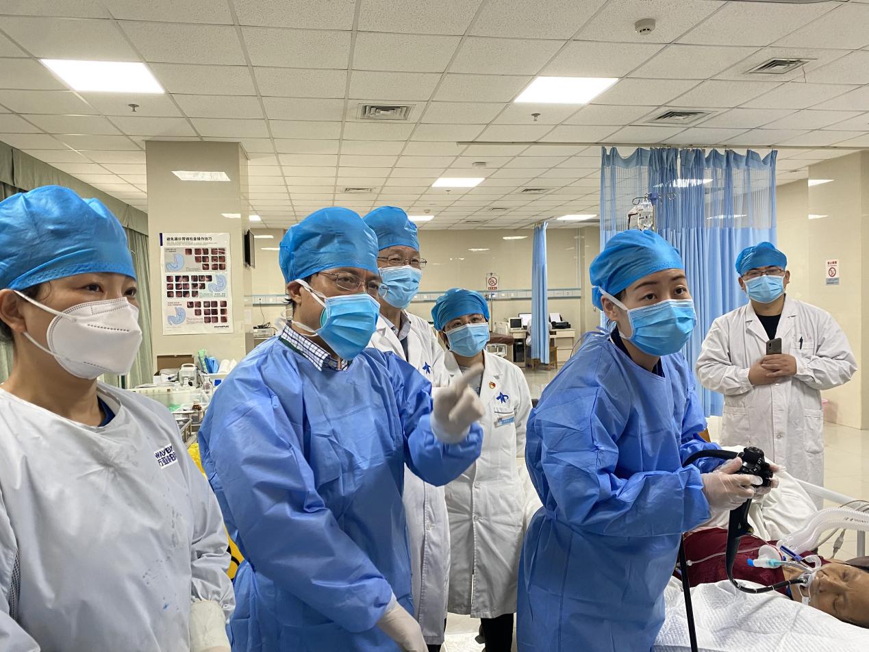 任牡丹副教授紧急与总院和水祥主任汇报沟通,大家分析病情后认为患者病情诊断不明,生命体征不平稳,随时有生命危险,必须立即进行内镜下急诊诊治,但如果转至总院可能会给患者的生命安全带来更大风险。时间就是生命,片刻不能拖延,和水祥主任立刻协调部署,联系许君望教授,两人顾不上吃午饭,紧急办理了疫情期间出行证明,和水祥主任驾车,找寻可行的路线,接受疫情防控站点的检查,一路奔波近2个小时赶往阎良紧急会诊。