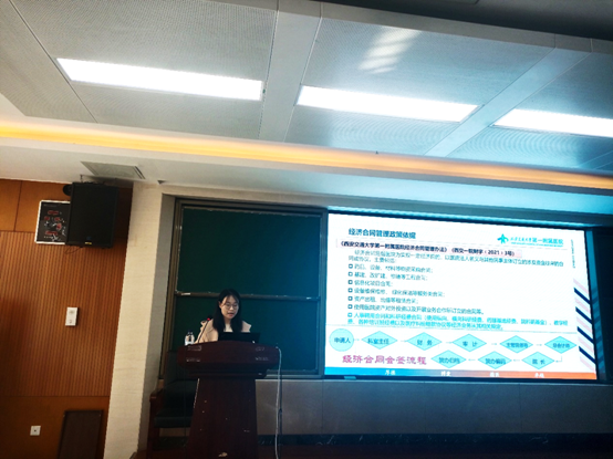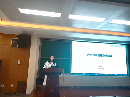 财务部陈芬部长对医院《经济合同管理办法》的要点进行详细解读和培训,从财务管理的视角,就日常经济合同管理过程中发现的问题提出行之有效的改进方法,强调经济合同是重要的法律文书,各部门都是本部门经济合同的第一责任人,要建立起合同管理台账,全面掌握合同的订立、签署、执行等情况。党院办(法务办)苏梓涵通报了2022年医院经济合同自查发现的问题,从法务角度提出了下一步合同管理的方向和改进建议。