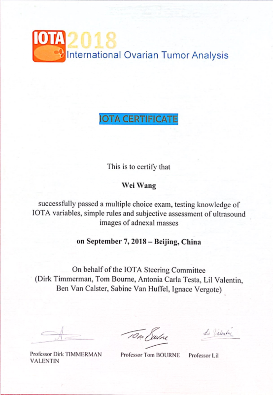对自己要求很高的王玮在提升专业技能方面的步履从未停歇,她还利用业余时间学习并考取了中国遗传学会临床遗传咨询能力专项培训合格证书,还通过了全英文考试的国际IOTA&ADNEX多中心认证资格证,一切的努力就是为了掌握更多的知识为患者服务、更好地配合临床的工作。