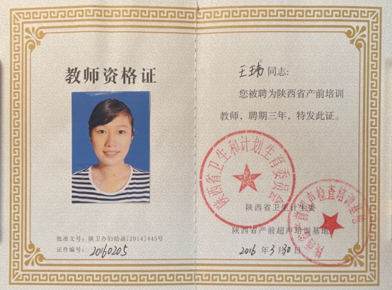 2011年王玮从交大临床医学专业毕业后以优异的成绩被保送攻读我院妇产科学研究生,经过3年扎实的临床专业能力和实操训练,多次获得国家奖学金的她在毕业后选择了妇产超声方向。妇产超声对她是一个全新的领域,但凭借妇产专业知识的扎实积淀,王玮对胜任新的专业方向充满信心。勤奋又爱钻研的她在专业技术方面提高很快,不出三年便掌握了妇产超声目前相关的全部专业技术,不仅获得相关必须的资格认定,还获得了国家母婴保健产前超声诊断资质及陕西省产前超声诊断资质,是陕西省20名产前超声培训教师中最年轻的一位。