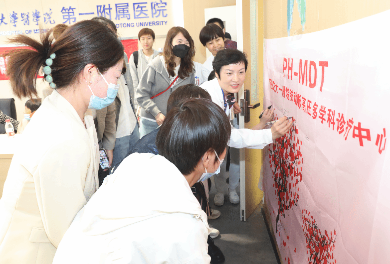 5月5日,2023年肺动脉高压日来临之际,我国著名的肺血管专家、CDQI国家肺血管中心秘书长范粉灵带领结构性心脏病科王海燕主任、呼吸科李满祥主任、心外科重病医学专家师桃主任、风湿免疫科孙怡宁教授、护理专家裴鸣教授等,在交大一附院门诊举办盛大的多学科义诊活动,患者及家属蜂拥而至,纷纷前往咨询就诊。之后一如往年医患一家,共绘“生命树”,数名老患者及家属感动不已,借此时机,献上数张锦旗题语表达深厚的医患情谊及对范粉灵教授团队的高度评价和表达心声!温馨而感人的“一家人”!!