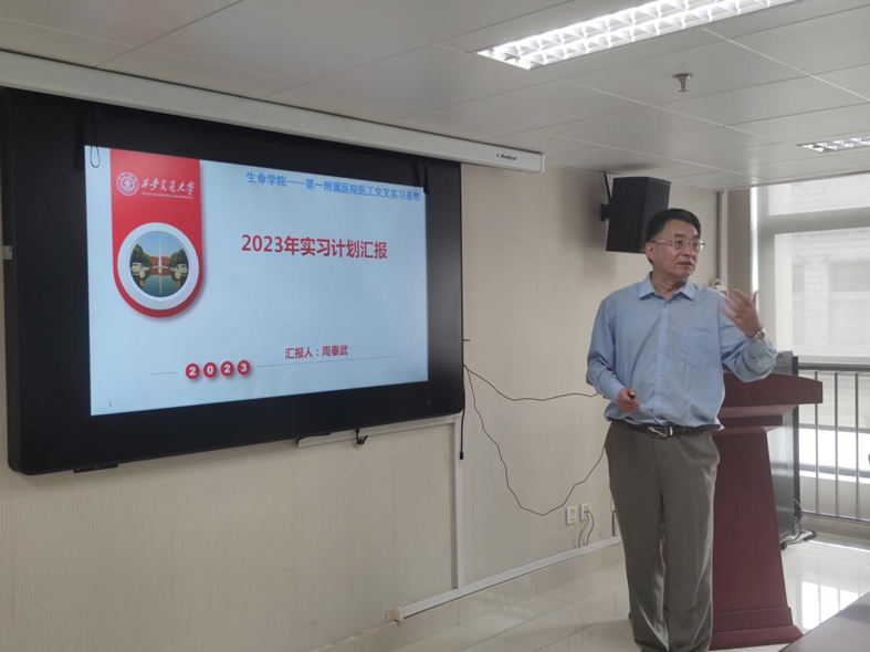 生命学院生物医学工程系周秦武副主任代表学院介绍了本科生实习方案调整情况,此次生命学院本科生来院实践活动分为认知实习和生产实习,并详细介绍了学院关于学生在院实习期间的教学安排,包括内容要求和轮转分组方案。