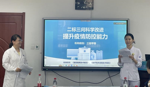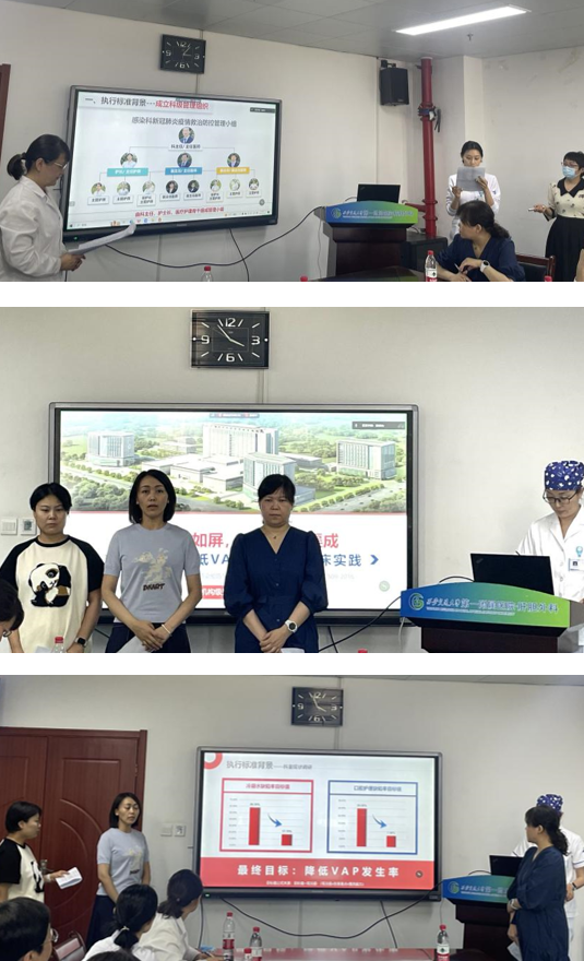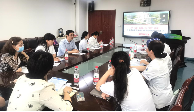 会议初始由感染性疾病科团队进行汇报演练,汇报项目以《二标三问科学改进,提升疫情防控能力》为主题,从执行标准背景、计划、过程、成效以及建议五个方面进行详细展示;接下来重症医学科中心ICU以《守“口”如屏,水“倒”渠成》为主题探讨了精细化管理降低VAP发生率的临床实践,对标重症监护病房院感预防相关规范,利用管理手段和技术降低VAP等院内感染的发生。