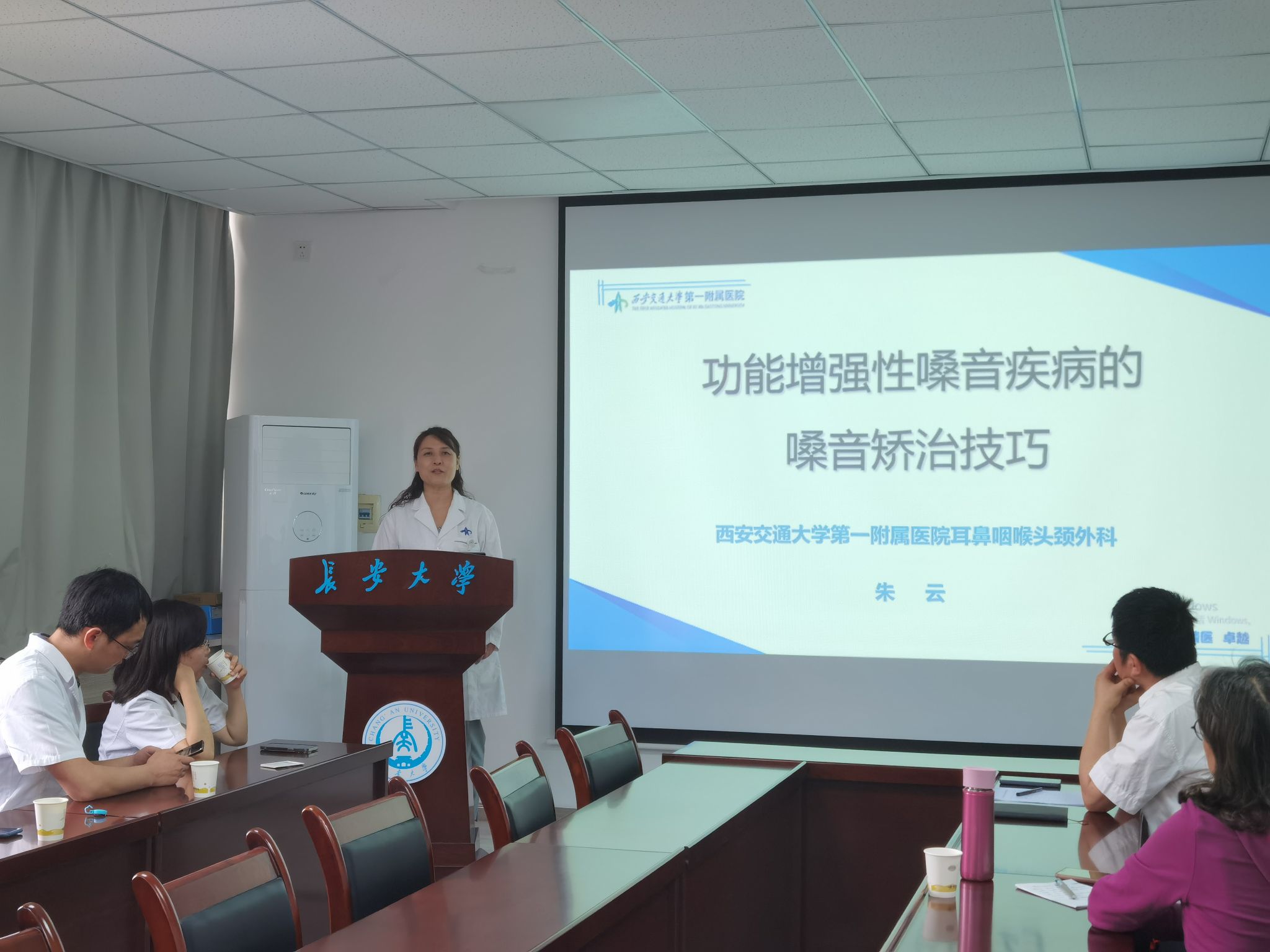 4月16日是第22 个世界嗓音日,我院耳鼻咽喉头颈外科连续举办了一系列的科普宣传、义诊等活动。继嗓音专病门诊开诊、与西安音乐学院互设实践基地、门诊义诊、科普宣讲进小学等系列活动之后,5月23日,耳鼻咽喉头颈外科咽喉嗓音团队再次走进长安大学,在长安大学工会地测学院分会潘迎副书记的主持下,为地测学院的老师们带来了一系列精彩的科普讲座。讲座就教师日常用嗓过程中常见问题的预防、常见嗓音疾病的治疗、嗓音的保护及合理用嗓等问题,做了细致全面的介绍。在讲座后的互动环节中,通过面对面的交流,解答了很多老师用嗓过程中遇到的问题。