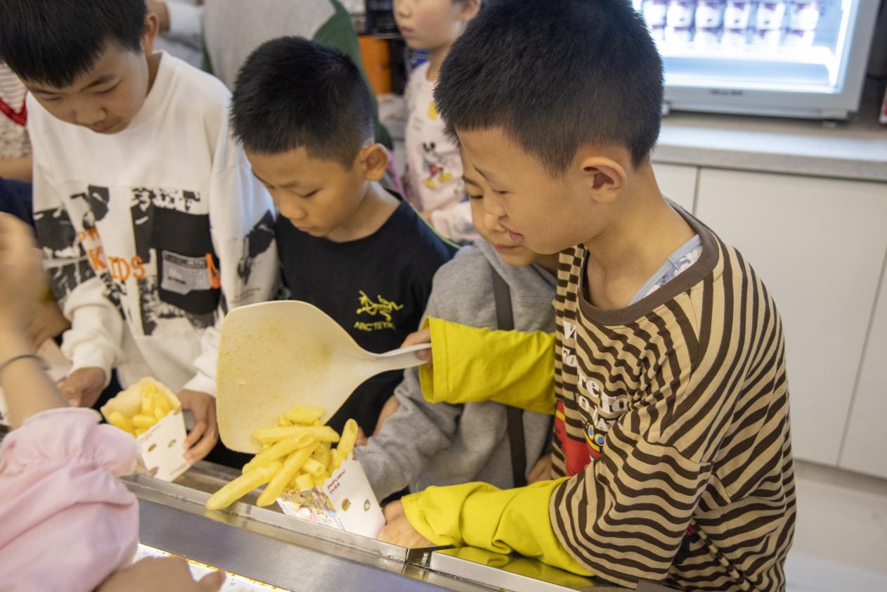 在检票口和售卖中心,影院工作人员向孩子们介绍了检票、售卖的常用话术和基本操作方式,在工作人员的指导下,小朋友们分别扮演起顾客和工作人员——“您好,请问您要点什么?”“我想要一杯可乐和一个大份爆米花”“好的,请您扫码支付”,孩子们兴趣盎然、跃跃欲试,积极参与体验活动,有模有样地变身为“小小电影家”。