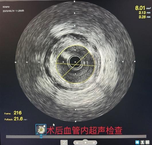 5月31日经过充分的术前准备,雷新军教授带领景林德博士和李瑞峰医生按照预定方案为患者实施了手术。冠脉造影示:RCA 2段节段性狭窄约25%,末端狭窄约90%,为不稳定斑块,血流TIMI 3级(图2a)。决定干预右冠:6F SAL1.0指引导管到位后,先操控Sion导丝通过病变至LV末端,然后再沿导丝送入血管内超声(intravenous ultrasound,IVUS)检查,结果显示RCA 2段末狭窄最重部位血管面积为2.30 mm2,斑块负荷为85%,手术指征明确(图2b)。首先,使用NC Balloon 3.0 x 15 mm 20 atm预扩张靶病变,造影示残余狭窄约25%,再在IVUS指导下植入Xinsorb BRS 3.5 x 28 mm,随后采用NC Balloon 3.5 x 9 mm 16atm逐段后扩张,造影显示支架充分膨胀,血流TIMI 3级(图2c-g)。最后,进一步使用IVUS评估手术情况,结果显示:支架充分膨胀,贴壁良好,支架远近端未见夹层,血管面积为8.01 mm2,手术效果非常满意(图2h)。术中患者无特殊不适,术后病人安返病房。