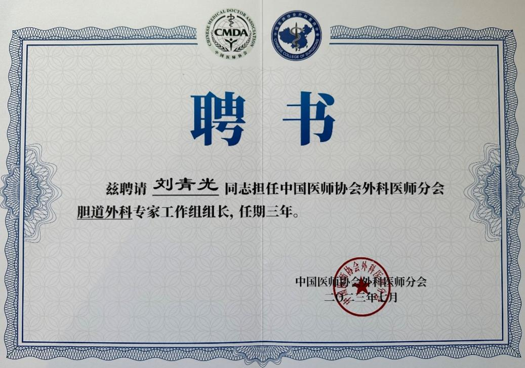 刘青光教授当选中国医师协会外科医师分会胆道外科专家工作组组长