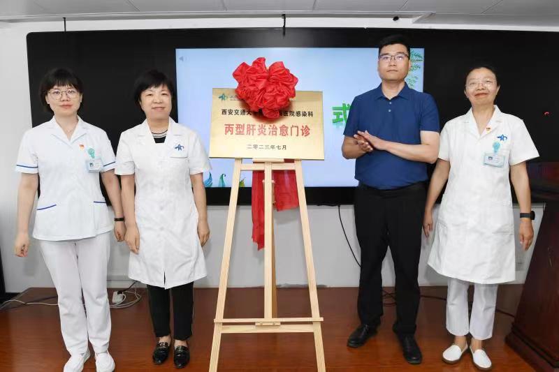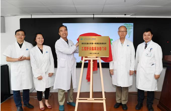 为了践行《“健康中国2030”规划纲要》及落实世界卫生组织提出的“2030年全面消除病毒性肝炎”的全球战略,让更多的人了解病毒性肝炎,了解病毒性肝炎的临床治疗进展,从而达到消除病毒性肝炎这一长远目标。西安交大一附院感染科于2023年7月27日上午,在科教楼601会议室举行“乙型肝炎临床治愈”和“丙型肝炎治愈”专科门诊揭牌仪式。会议邀请到陕西省疾控中心任强所长,交大一附院医务部李红霞部长、叶峰副部长,公卫中心许庆丽主任、护理部温秀蔺主任护师,宣传部纪晶晶参加。
