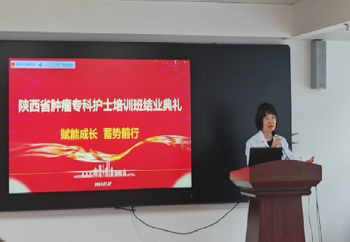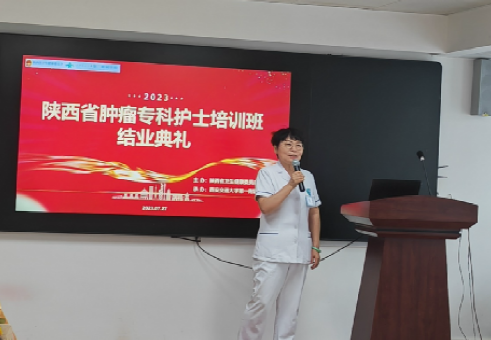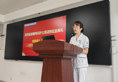 李洁琼副主任也对肿瘤专科护士第二期培训班圆满结业表示祝贺。她对学员们展示的成绩给予了肯定,同时也对学员们提出了更高的希冀。她指出我们现在所有人,就是助力于我们所在专业,所在医院高质量发展的赋能的重要火种,精心安排的课程,实践带教,一对一点评,开题报告,让大家从零到一、到十到一百。学员们要做好身份角色的转变,成为一名临床肿瘤专家、临床教师、临床研究者,一枝独秀不是春,希望所有的学员们将所学所获所得的新理念、新技术、新知识,传播给更多的临床护士们,助力医院及肿瘤专科护理高质量发展,让陕西省肿瘤专科的工作更上一层台阶!