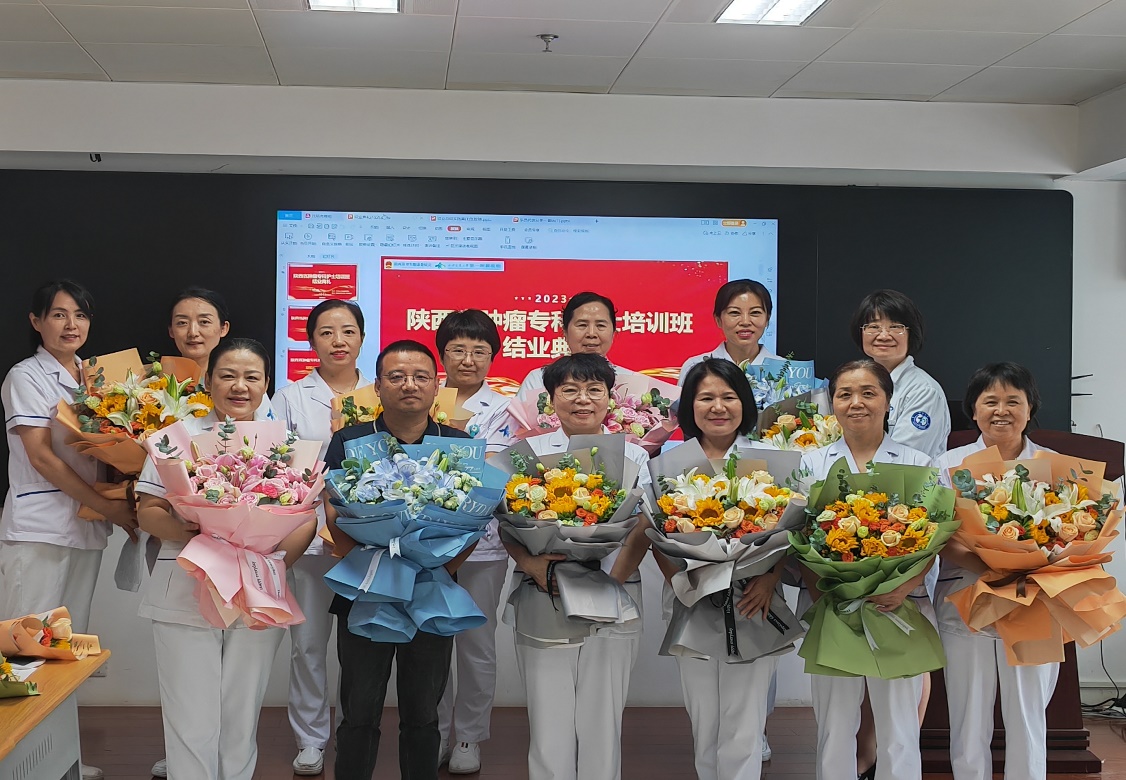 时光荏苒,白驹过隙。2023年7月27日上午,第二期陕西省肿瘤专科护士培训班西安交大一附院基地结业典礼在我院科教楼606会议室盛大举行。护理部辛霞主任、李洁琼副主任、肿瘤内科锁爱莉副主任、肿瘤辖区乔莉娜总护士长、医患办负责人杨志平老师及各病区护士长、第二期培训班全体学员参加典礼,活动由肿瘤内科副护士长李宁主持。结业典礼在培训班精彩集锦回眸和学员们精彩走秀中正式开始。
