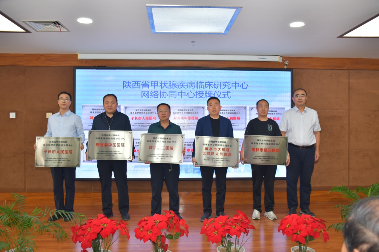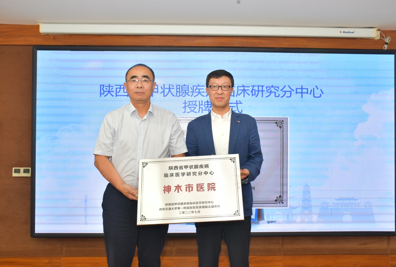 西安交大一附院耳鼻咽喉头颈外科是陕西省科技厅和卫健委联合授予的“陕西省甲状腺疾病临床研究中心”。为更好的形成陕西省甲状腺疾病防控网络,组建甲状腺疾病规范化诊治和临床研究体系,将关键技术和诊疗规范在省内广泛推广,应陕西省科技厅及卫生和计划生育委员会要求及批准,特将神木市医院设立为陕西省甲状腺疾病临床研究分中心 ,将子长市人民医院、府谷县中医医院、府谷县人民医院、府谷电力医院、榆林市中医医院、神木第二医院、神木市大柳塔试验区人民医院、榆林市星元医院等八家医院设为首批陕西省甲状腺疾病临床研究网络协同中心。本次会议举行了陕西省甲状腺疾病临床研究中心分中心及网络协同中心授牌仪式,由中心主任张少强教授分别为各分中心及网络协同中心授牌。