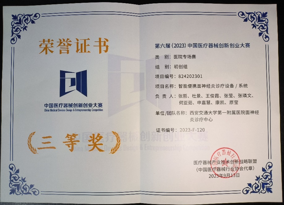 9月中旬,第六届(2023)中国医疗器械创新创业大赛在苏州圆满落幕。该大赛被誉为国内医疗器械领域最权威的赛事之一。本届大赛所有参赛项目共计926个,中医科副主任张哲带领东院区中医•康复科团队在本次大赛中的参赛项目“智能便携面神经炎诊疗设备/系统”,经过激烈角逐,最终获得全国医院专场赛三等奖。