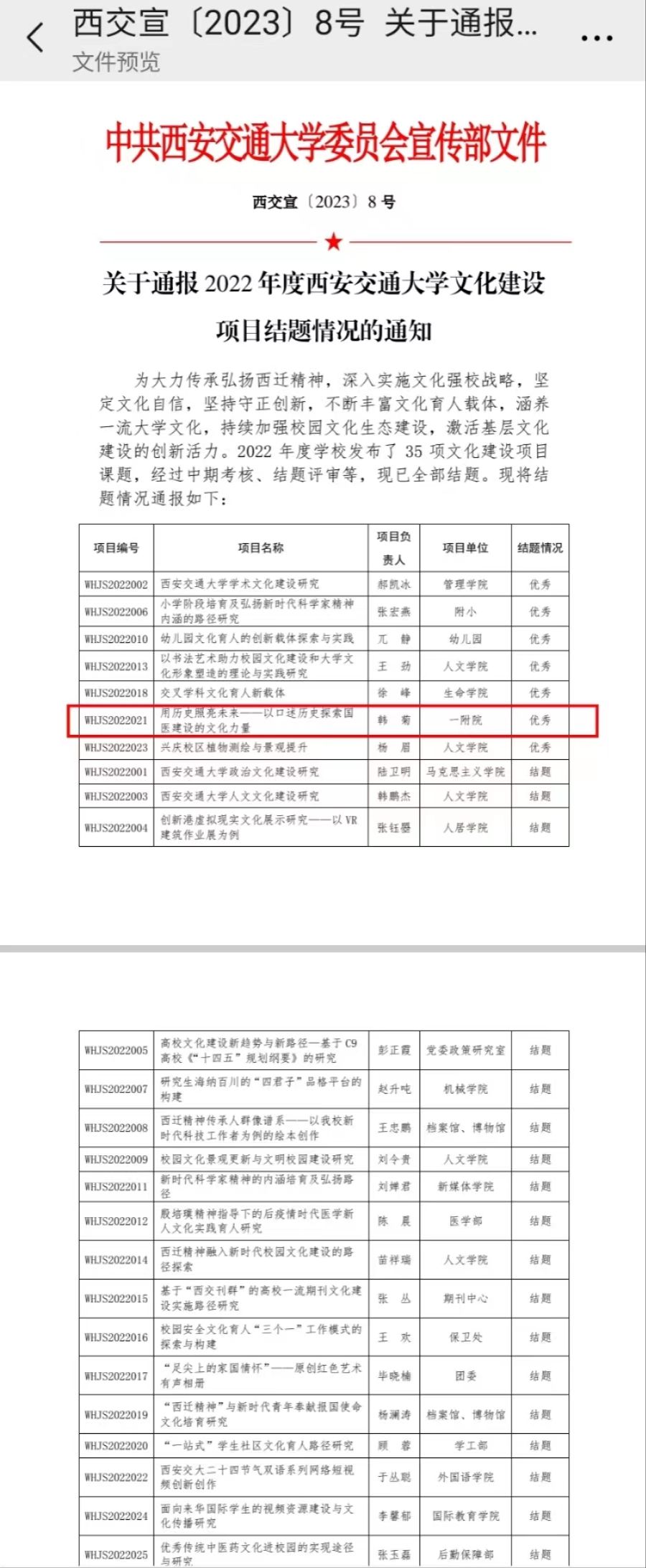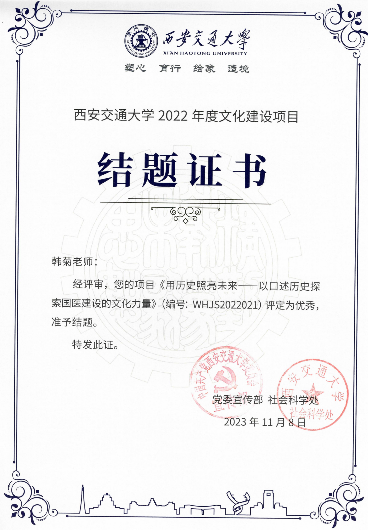为大力传承弘扬西迁精神,深入实施文化强校战略,坚定文化自信,坚持守正创新,不断丰富文化育人载体,涵养一流大学文化,持续加强校园文化生态建设,激活基层文化建设的创新活力。2022年度西安交通大学发布了 35 项文化建设项目课题,经过中期考核、结题评审,由我院党委副书记韩菊牵头报送的《用历史照亮未来——以口述历史探索国家医学中心建设的文化力量》获得优秀结题。