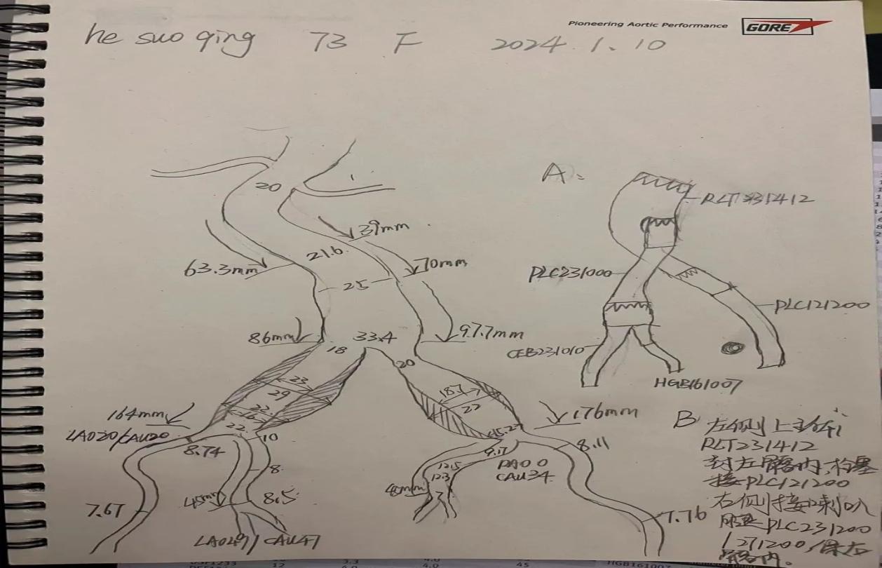 入院后,经详细检查,发现彭奶奶动脉瘤解剖形态复杂,入路血管狭窄扭曲,介入血管外科主任刘建林教授组织全科讨论,大家一致认为,若釆用外科开刀手术,切除血管瘤人工血管移植,创伤大,手术并发症多,加上患者年事已高,体重不足100斤,最好采用微创治疗。釆用常规覆膜支架腔内手术,因患者入路血管狭窄扭曲,支架系统难于到位,也可能导致手术失败。经再三讨论,最后决定釆用国产原创超细输送系统腹膜支架(Minas)治疗该例患者。