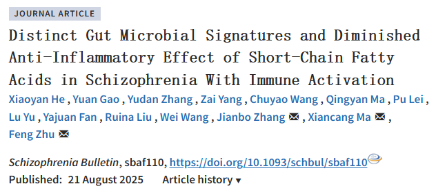 2025年8月21日,西安交大一附院精神心理卫生科马现仓、朱峰教授团队在精神病学权威期刊《Schizophrenia Bulletin》(中科院1区,精神分裂症研究领域国际公认的顶刊)上发表原创研究论文《Distinct gut microbial signatures and diminished anti-inflammatory effect of short-chain fatty acids in schizophrenia with immune activation》(中文题目:精神分裂症免疫激活亚型的独特肠道菌群特征及短链脂肪酸抗炎作用的减弱),首次系统分析了伴有免疫激活的精神分裂症患者的肠道菌群特征、血清免疫激活标志物及短链脂肪酸(SCFAs)水平之间的多组学关联,并进一步揭示了肠道菌群代谢产物-短链脂肪酸在精神分裂症免疫紊乱中的作用。