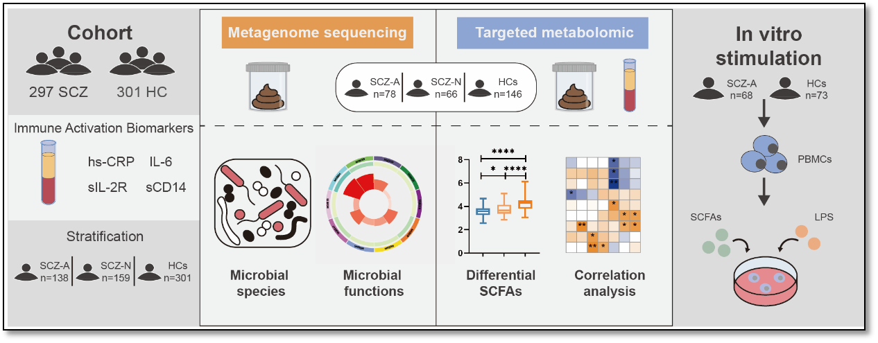 据此,该团队提出科学问题:免疫激活亚型精神分裂症患者的肠道菌群特征是否发生改变?患者SCFAs水平及其免疫调节作用是否因此受到影响?基于这一问题,该研究纳入297例精神分裂症患者和301例健康对照,通过四种血清免疫介质界定外周免疫激活亚型,并对144例患者及146例对照的粪便和血清样本开展宏基因组测序及SCFAs水平检测。