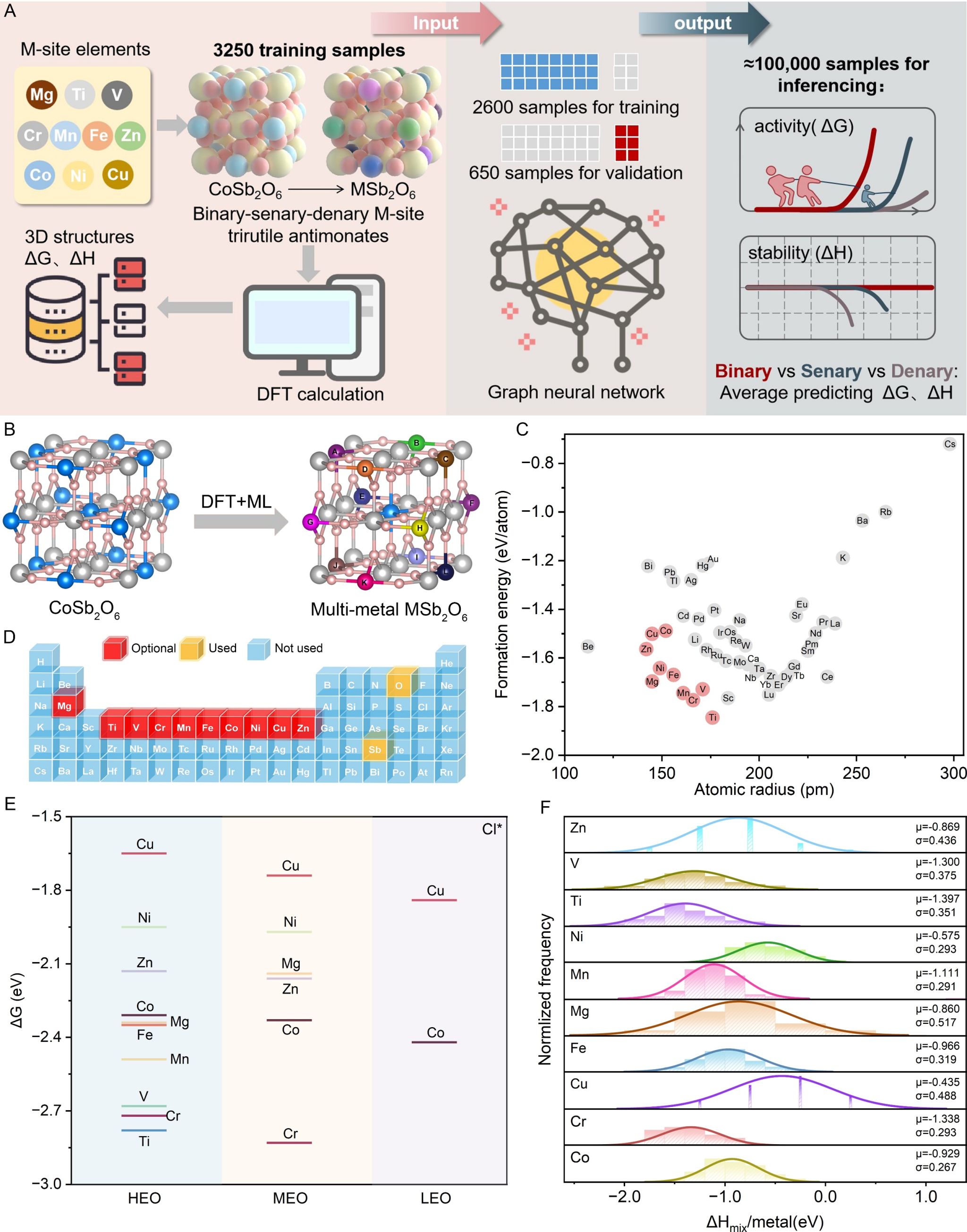 针对这一挑战,西安交通大学第一附属医院MED-X研究院再生与重建医学研究所吕毅教授、刘晓菲副研究员以及动力工程多相流国家重点实验室沈少华教授等多学科团队提出了原子级“熵引导”(entropy-guided)材料发现策略,从单一的CoSb2O6结构出发,通过DFT系统计算不同金属取代后形成能与晶格兼容性,从元素周期表中筛选出10种金属构建可稳定共存的高熵体系(MSb2O6,M = Mg, Ti, V, Cr, Mn, Fe, Co, Ni, Cu, Zn)。进一步结合图神经网络(GNN)与蒙特卡洛采样,在10⁵个可能构型中预测出最具热力学与电催化优势的组合,揭示高熵材料的多组元无序结构可降低体系自由能(ΔG = ΔH − TΔS)并优化活性位的电子分布。理论计算表明,随着金属组元由2、6到10种逐步增加,反应能垒不断降低,Cu位点成为最优活性中心。