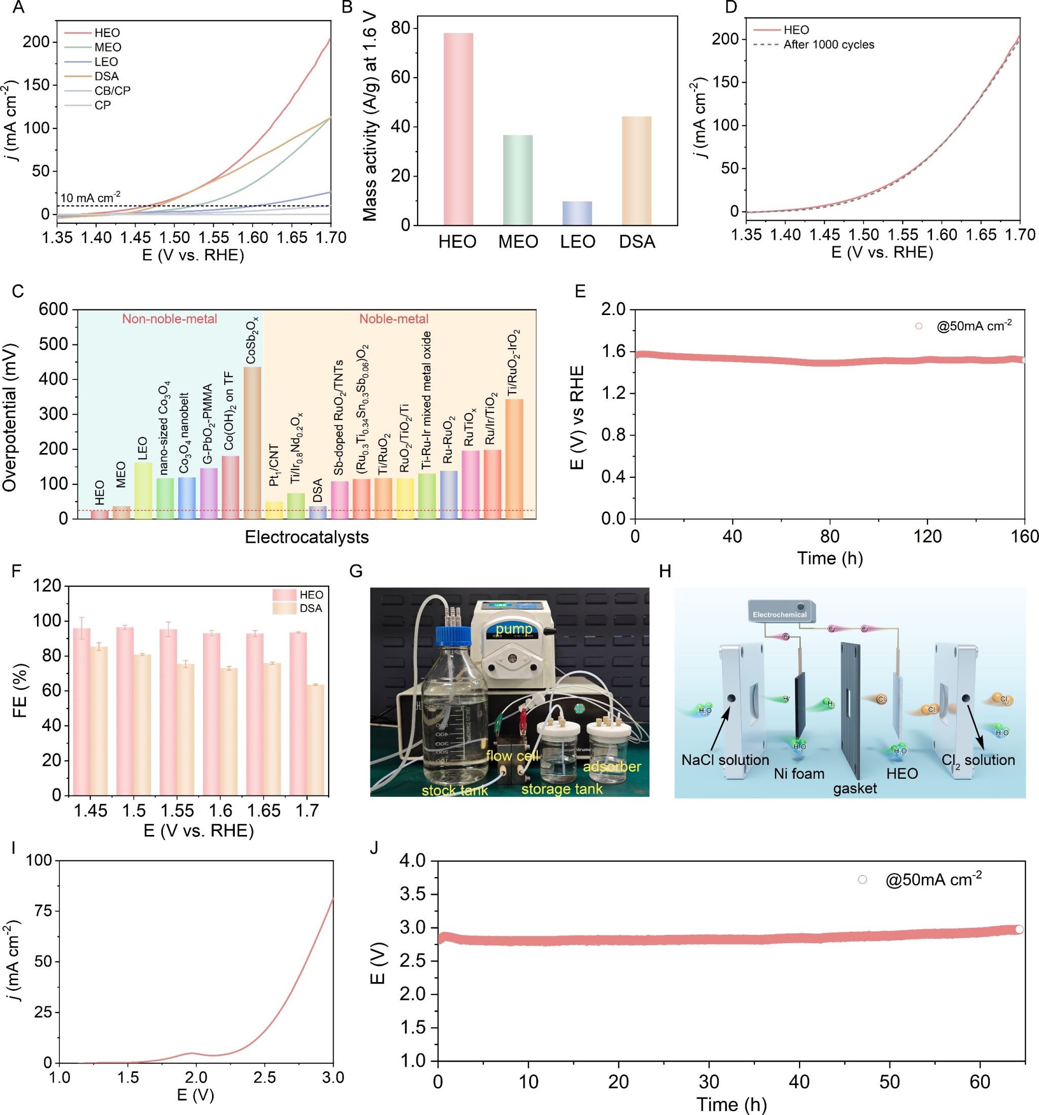 团队随后采用1173 K固相煅烧法成功合成出纯相十元MSb2O6高熵氧化物,并通过XRD、HAADF-STEM和ICP-OES确认其为均一分布的三金红石结构。应力分析进一步揭示该体系具有显著的晶格应变,从而弱化了金属-氧键、增强了电子迁移与中间体吸附能力,从而显著加快Cl-的电化学氧化动力学。在4 M NaCl-HCl电解体系中,十元高熵催化剂在10 mA cm-2时过电位仅24 mV,具有超过95%的法拉第效率以及160小时无衰减稳定性。其质量活性高达78.1 A g-1,是商用DSA的约两倍,而成本仅0.46美元/m2,体现出显著的工业应用潜力。机理分析表明,该体系遵循Cl吸附路径而非OCl路径,Cu位点周围的高熵环境与氧空位协同降低了反应能垒。密度态计算也显示该材料在费米能级附近具有高电子态密度,有利于电子转移与中间体吸附。