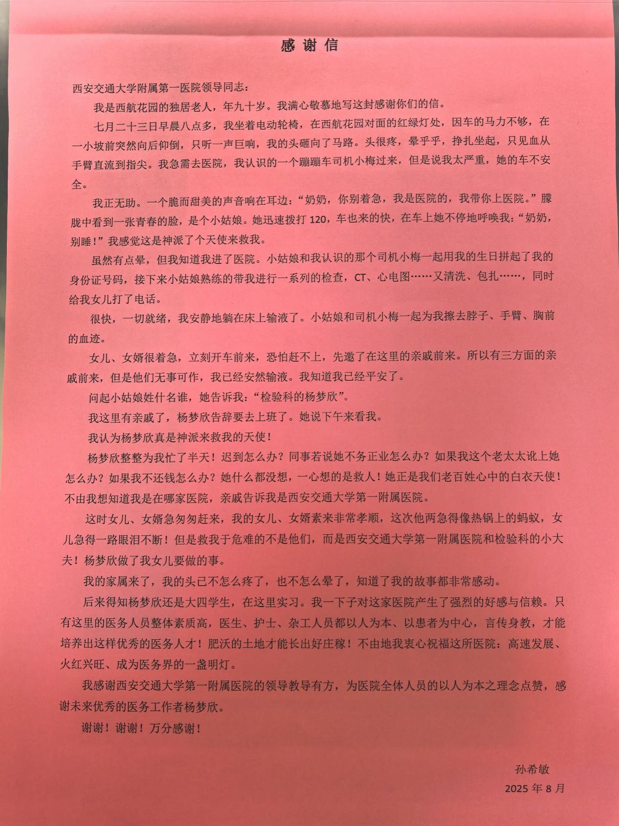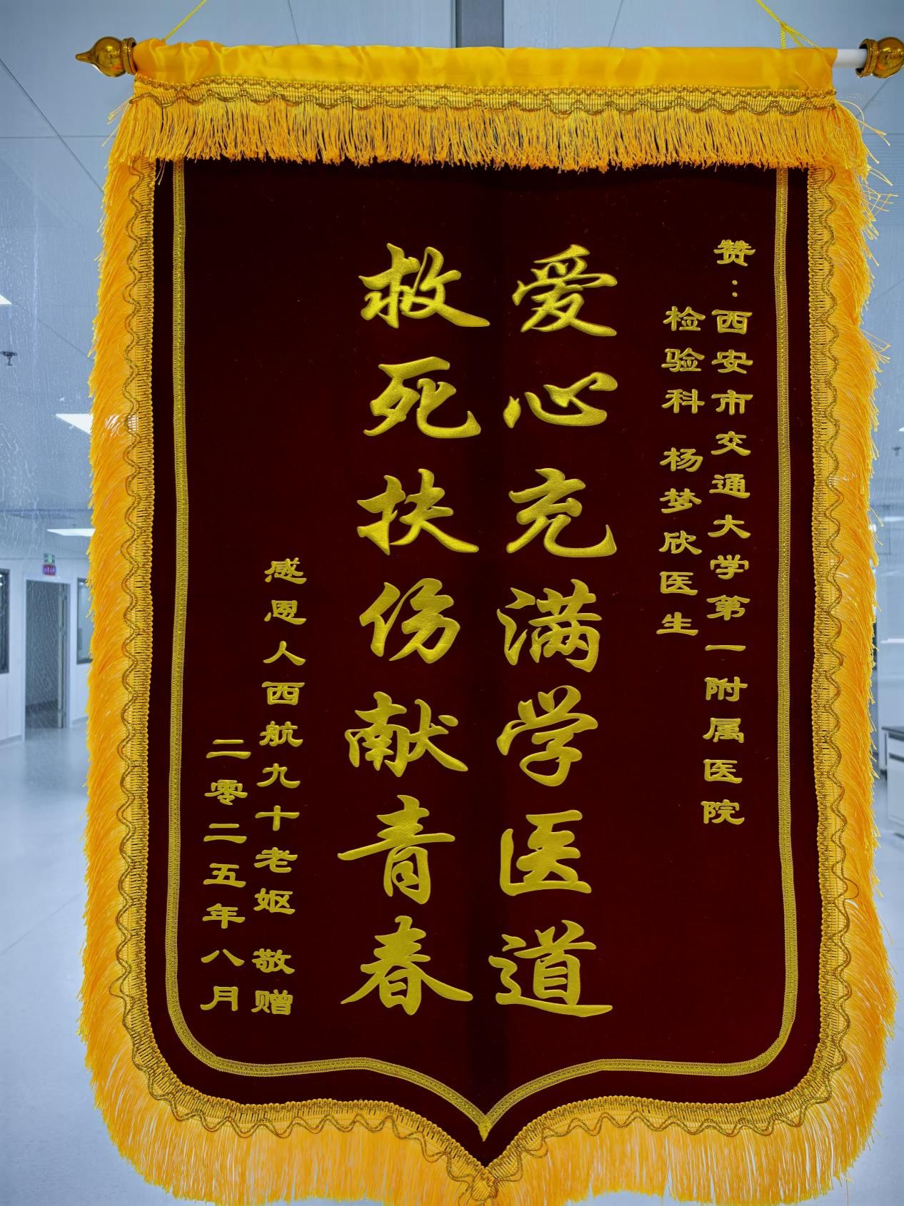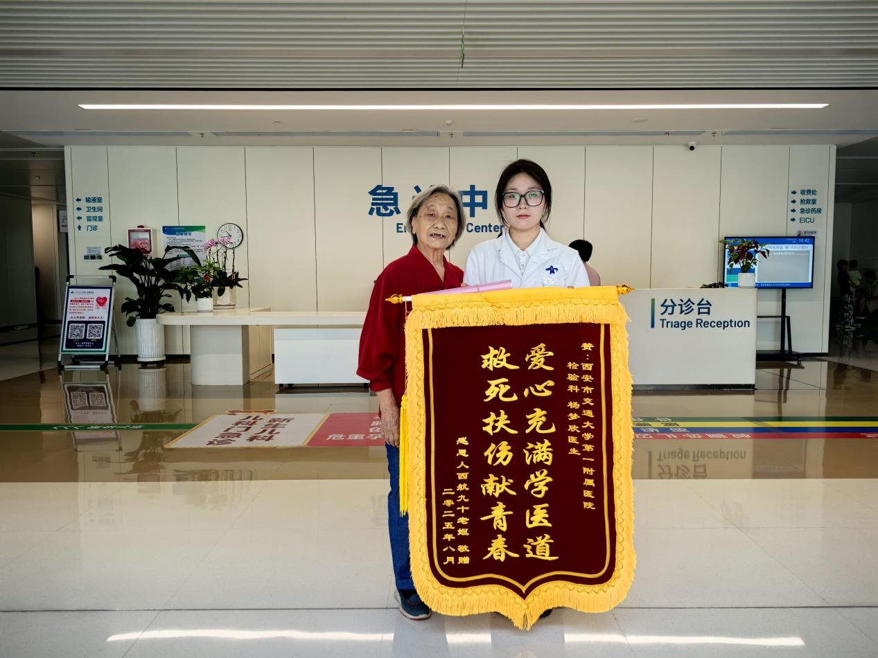 事后老人家属专程送来锦旗与感谢信,感动地表示:“幸亏有杨同学这样专业又善良的医学生在现场,不慌不乱、处置得当,是我们全家的恩人。”信中真挚的言辞,不仅是对杨梦欣个人行为的充分肯定,也是对西安交大一附院医学生医者仁心的高度认可。杨梦欣目前为大四实习医生,在我院陆港院区检验科轮转学习。她表示:“当时没多想,就觉得不能把老人单独留下。我相信我们医院的任何一个人遇到这种情况,都会这么做。”