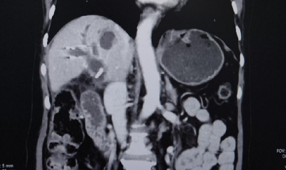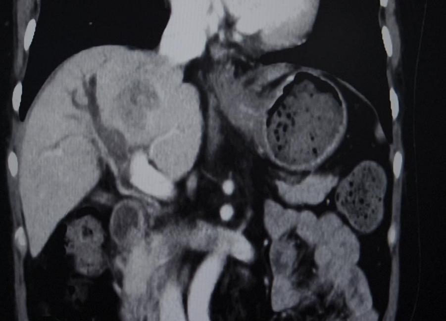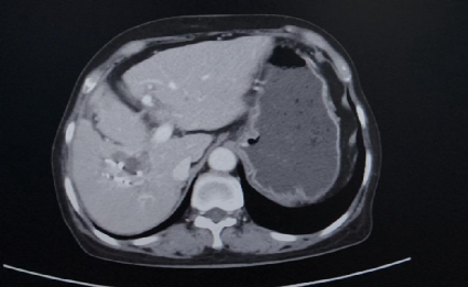 CT(2025.2.18):1、肝右叶异常强化团块影伴周围胆管扩张,考虑肝内胆管癌可能性大,门静脉右支充盈缺损影,考虑癌栓形成。2、脾脏缺如;胆囊、胰腺、双肾及双侧肾上腺未见明显异常