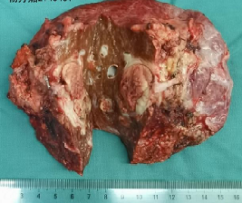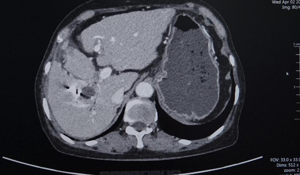 2025年4月9日张晓刚主任医师主刀下行腹腔镜探查,发现肝脏周围粘连较重,肝脏质地较脆,存在轻度肝硬化,断面易渗血,遂中转开腹,行右半肝+右侧尾状叶+右侧肾上腺+胆囊切除术,手术顺利,术中出血约300ml,未输血,手术历时3小时。术后平稳恢复,1周后顺利出院。术后病理:“右叶”肝块状型低分化癌伴大片坏死,未侵及被膜。结合免组染色提示考虑低分化胆管细胞癌,片内结构符合治疗后改变,肝剥离面未见癌组织,“门脉癌栓”未见肿瘤活性, “右侧”肾上腺组织,胆囊慢性炎。