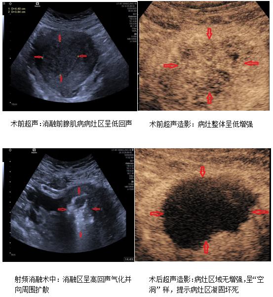 术中通过超声引导下人工腹水注入,隔离子宫与盆腔其他重要脏器和组织,有效保护包括肠管及膀胱等盆腔脏器免受无辜热损伤。在实时超声精准导航下,射频消融电极针分层分次穿刺进入子宫病灶区域,采取多点多次叠加消融模式,顺利完成病灶区消融操作,术前超声造影显示病灶区域血供丰富,呈“低增强”,术后即刻超声造影消融病灶区无造影剂灌注,呈无增强“空洞”样表现,客观验证了消融效果,提示病灶区域凝固坏死,消融成功。术后两位患者无并发症及特殊不适,24小时内顺利出院。此次微创手术不仅成功避免了传统子宫切除,保留女性生殖器官的完整性,减少了子宫切除术后的各种后续问题,同时有效改善和解决患者痛经症状,待术后治疗区域逐步回缩修复,亦可改善由于子宫肿大压迫周围脏器引起的便秘及尿频等症状。