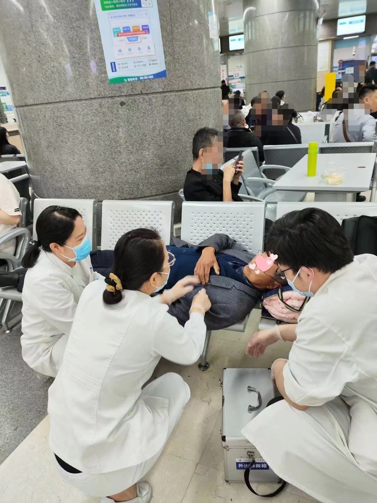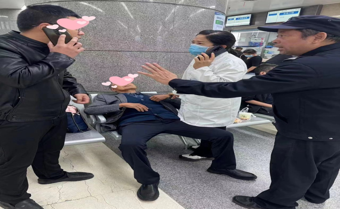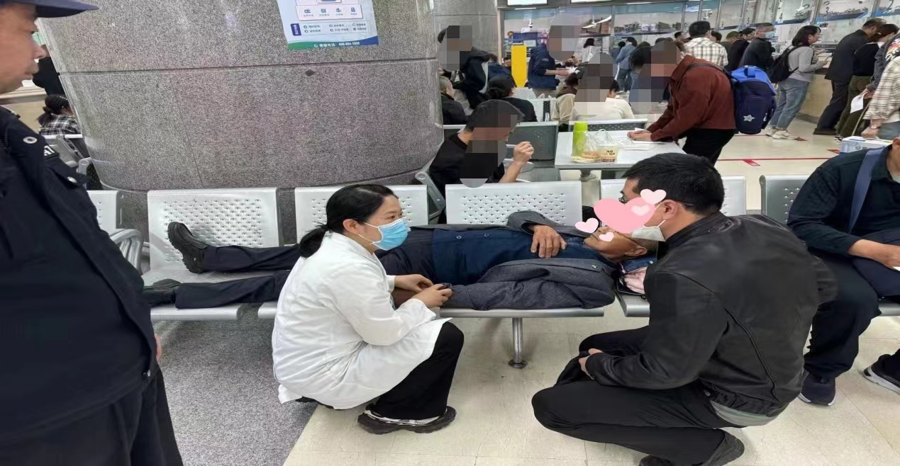 周围的人见状纷纷围了上来,家属正在拨打急救电话,有的试图安抚患者。患者服务中心孟君会老师看到立即冲上前询问家属,了解患者的情况,得知患者曾有心脏病史后,孟老师迅速拨通了急诊科的电话,简要描述了患者的病情,并请求紧急支援。