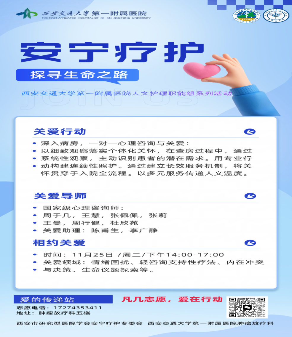 冬日的阳光透过病房的玻璃,温暖而静谧。2025年11月25日,在西安交通大学第一附属医院人文护理职能组大力支持下与西安市研究型医院学会安宁疗护专业委员会(以下简称“专委会”)的持续关怀与专业引领下,凡几安宁疗护心理咨询志愿者团队再次走进交通大学第一附属医院肿瘤放疗科,用一场场深入心灵的“一对一”咨询,为被病痛阴霾笼罩的患者与家属,注入了名为“希望”与“理解”的强心剂。