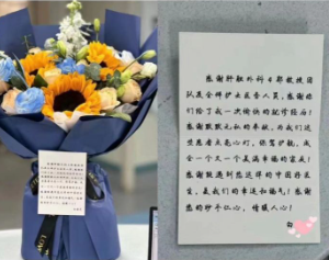 11月1日下午,肝胆四区护士站收到了一位出院患者白某家属送来的锦旗、鲜花及感谢卡片,患者家属表示:非常感谢郭成教授团队以及全体医护人员,感谢医护人员默默无私的奉献,为患者点亮心灯,保驾护航,体验了一次愉快的就诊经历。