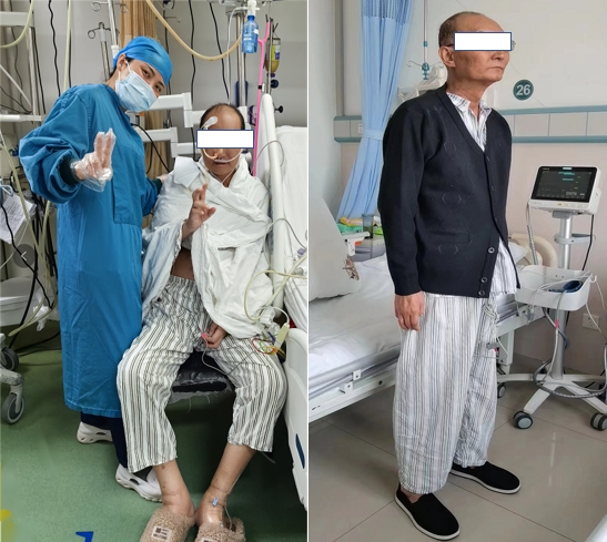 ECMO顺利运行19天后,经谨慎的评估和讨论,患者成功撤除ECMO。8天后患者顺利拔除气管插管,在49天的不懈努力下,患者经历了ECMO、ECMO串联CRRT、有创呼吸机三机联动、撤ECMO、撤气管插管、无创呼吸机更换为鼻导管吸氧的治疗过程。患者在救治的过程中一度出现四肢肌力0级(ICU获得性肌无力综合征),危重患者康复也贯穿了患者救治的全过程 ,从坐位到站立、出院时在家属的帮助下已经能够行走,目前该患者已回归家庭,回归社会。