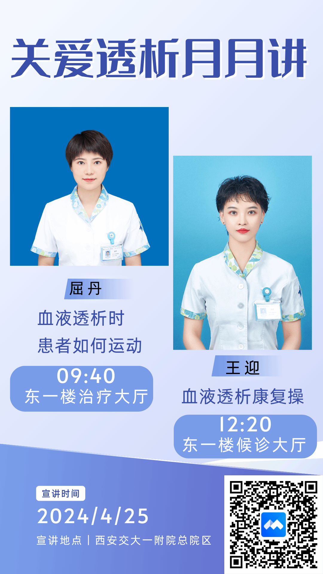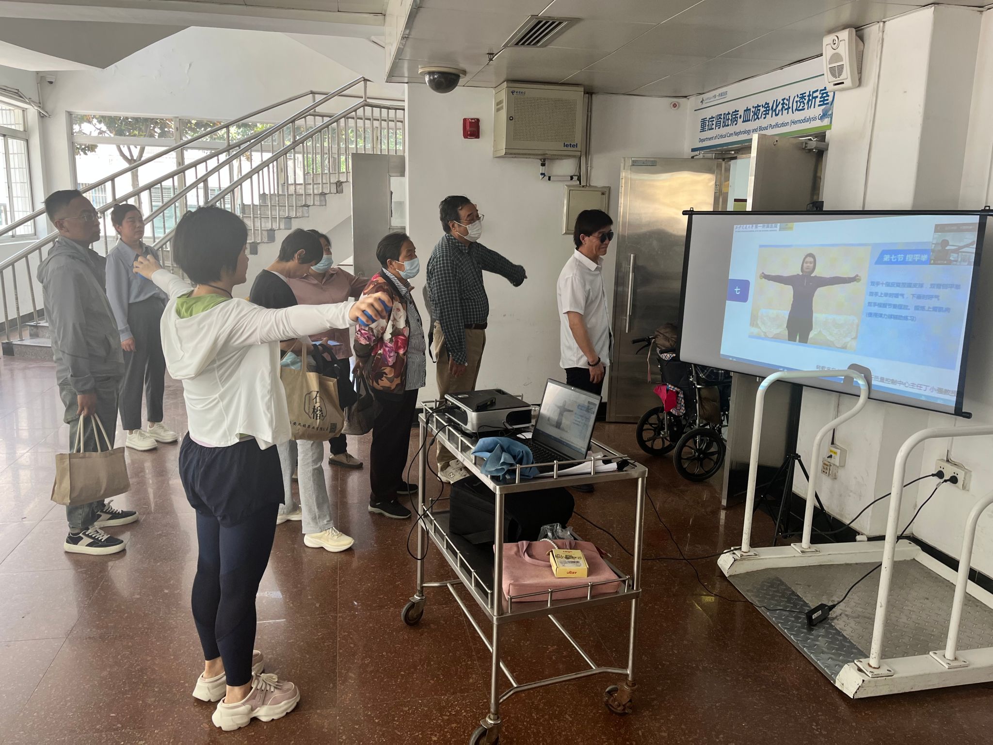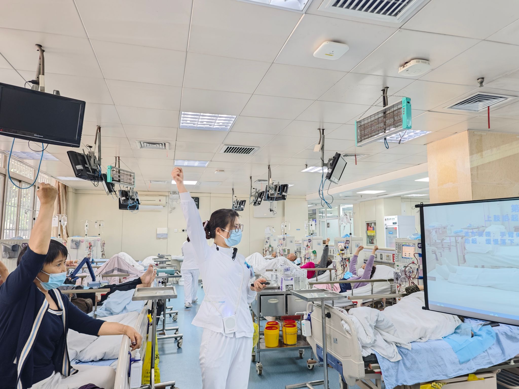 对于血液透析的患者来说,心肺功能下降、肌肉萎缩、生理和心理功能障碍等问题日渐突出,透析治疗时间长了,关节会变得越来越不灵活,也比较容易出现疼痛等症状,严重影响着患者的生活质量。但是俗话说生命在于运动,得了病还能运动吗?透析四小时躺着太累了,透析中间是否可以进行运动呢?这些问题困扰着肾友们。为了解决患者心中的顾虑和疑问,重症肾脏病·血液净化科“关爱透析月月讲”健康宣教活动于4月25日继续开讲,由屈丹护理师和王迎主管护理师分别为肾友们分别带来《血液透析时患者如何运动》和《血液透析康复操》。