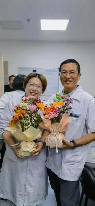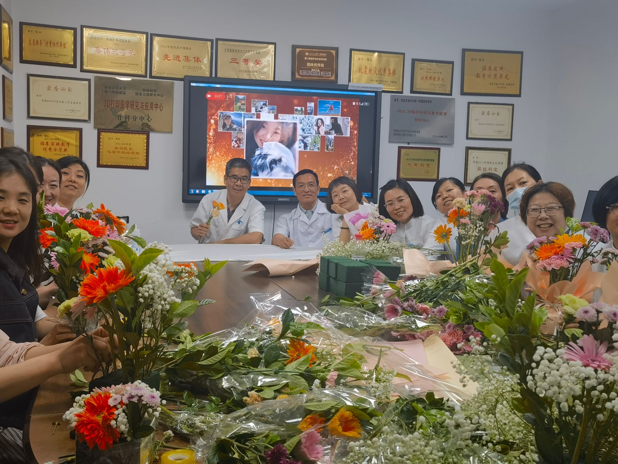 花艺讲究的是层次感,在老师指导下,大家一步一步学习插花,把原本普通花草,通过修建,搭配,变成一束束生机盎然的作品,每件都独一无二,每一件都灿烂美好,每一件饱含着白衣天使的敬重与美好祝愿。在庆祝活动当天还邀请骨科边卫国教授及李曙明教授做为嘉宾参与活动。 插花完毕,大家一起合影留念。